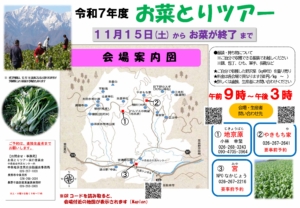 令和7年度 お菜とりツアーのお知らせ 2025.10.09 CATEGORY :イベント2025年11月15日(土)からお菜が終了するまでの間、地京原・やきもち家・宮の3会場で開催されます。野沢菜をご自身で収穫し、お持ち帰りすることができます。詳しい内容等につきましてはチラシをご覧ください。大勢の皆様のご参加を心からお待ちしております。※ 終了時期は、12月14日頃になると思われますが、天候等により前後する場合もあります。お菜とりツアーのチラシはこちら